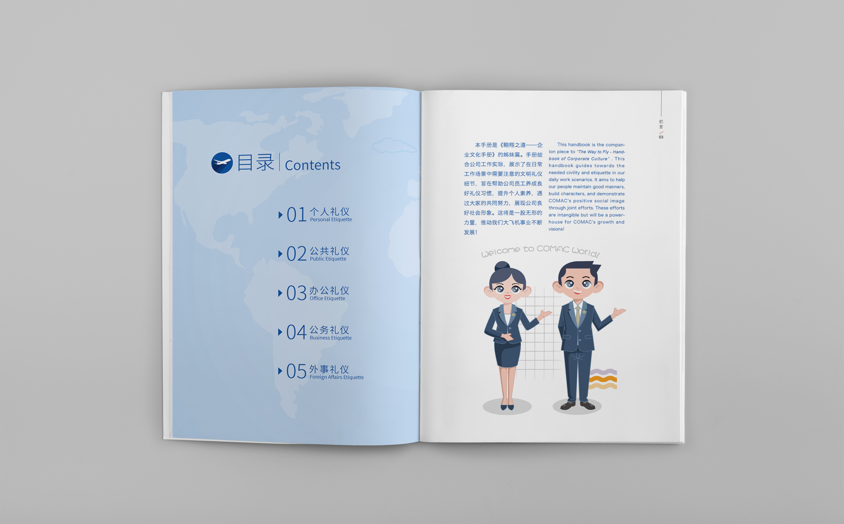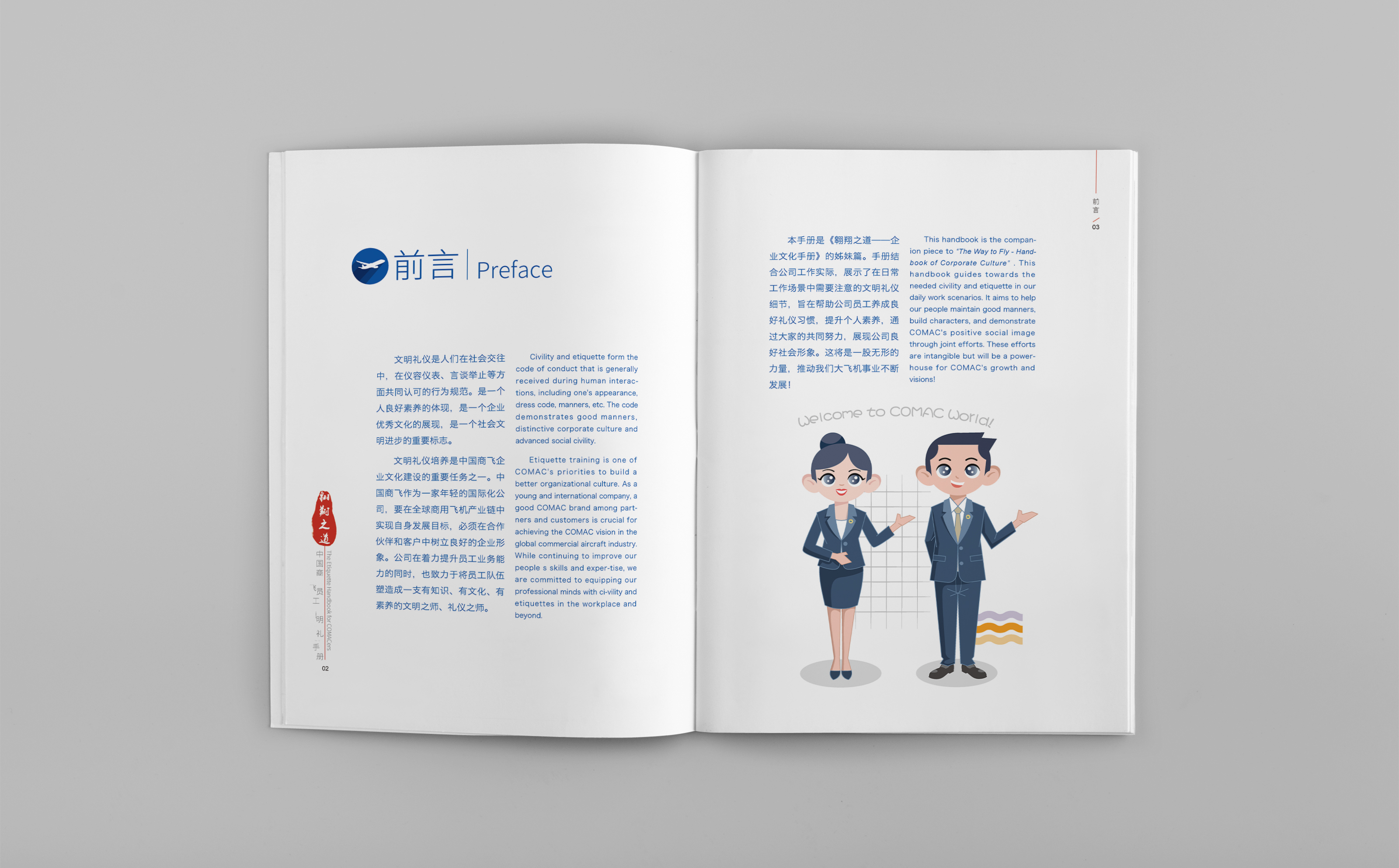 2020年,中國商飛(fēi)委托禾松設計品牌文化(huà)手冊,以商飛(fēi)企業文化(huà)爲基礎,融合企業形象元素、運用(yòng)插畫(huà)形式創意設計手冊。
